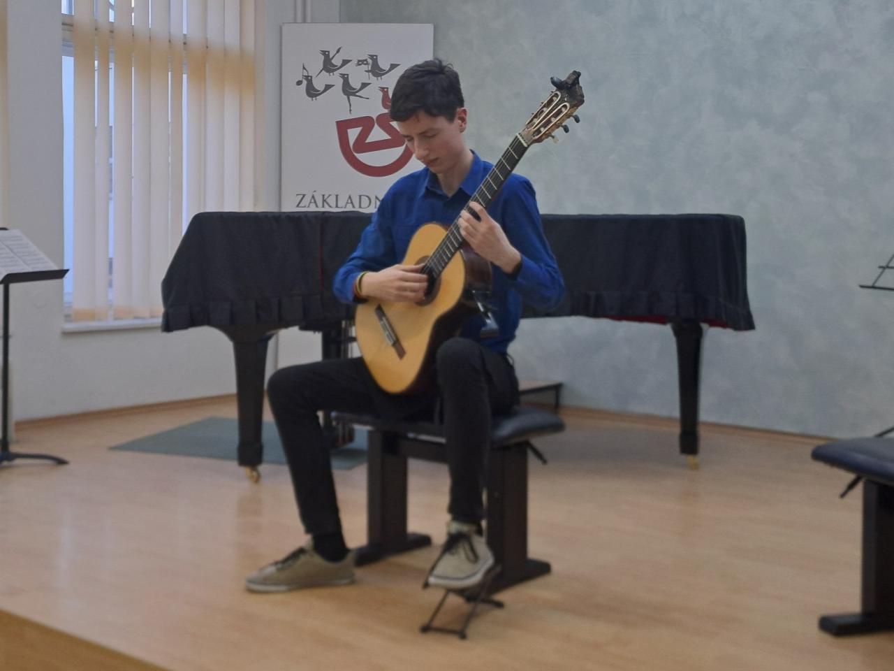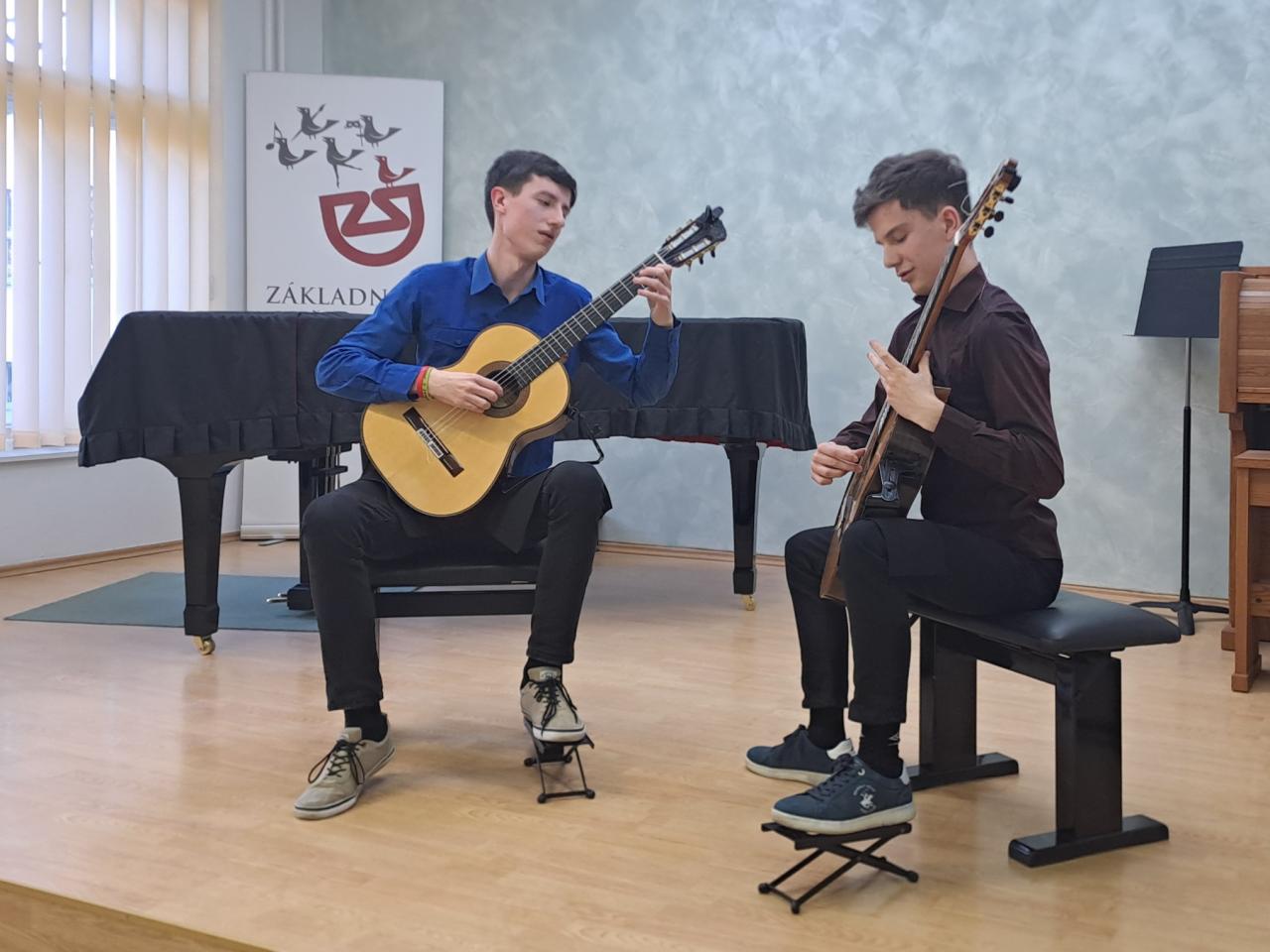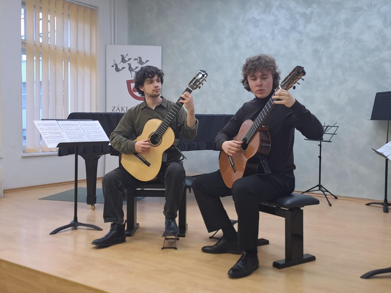 Atraktivní recitál si připravili studenti kytarového oddělení pardubické konzervatoře pro naše žáky, pedagogy i širokou veřejnost - ve čtvrtek 9. 4. vystoupili v našem koncertním sále. Ať už ve hře sólové či komorní v kytarovém duu přesvědčili přítomné publikum svými brilatními výkony o tom, že ve svém oboru právem patří k absolutní spičce České republiky.